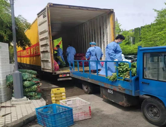 4月16日早上5点左右,一辆17.5米韵达厢式货车出现在上海戏剧学院校园内,随后在多名身穿防护服后勤工作人员协助下,一箱箱新鲜蔬菜从车厢内快速转运到学校食堂。