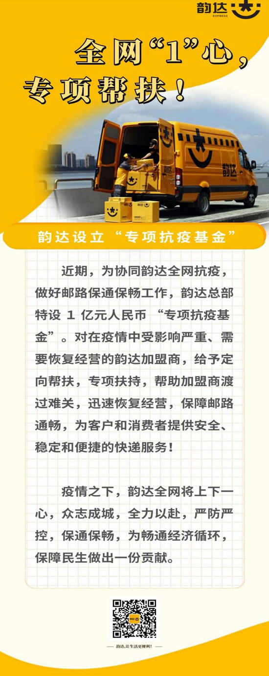 此外,为了协同韵达全网抗疫,做好邮路保通保畅工作,韵达总部还特设立1亿元人民币“专项抗疫基金”,对在疫情中受影响严重、需要恢复经营的韵达加盟商,给予定向帮扶,专项扶持,帮助加盟商渡过难关,迅速恢复经营,保障邮路通畅,为客户和消费者提供安全、稳定和便捷的快递服务!